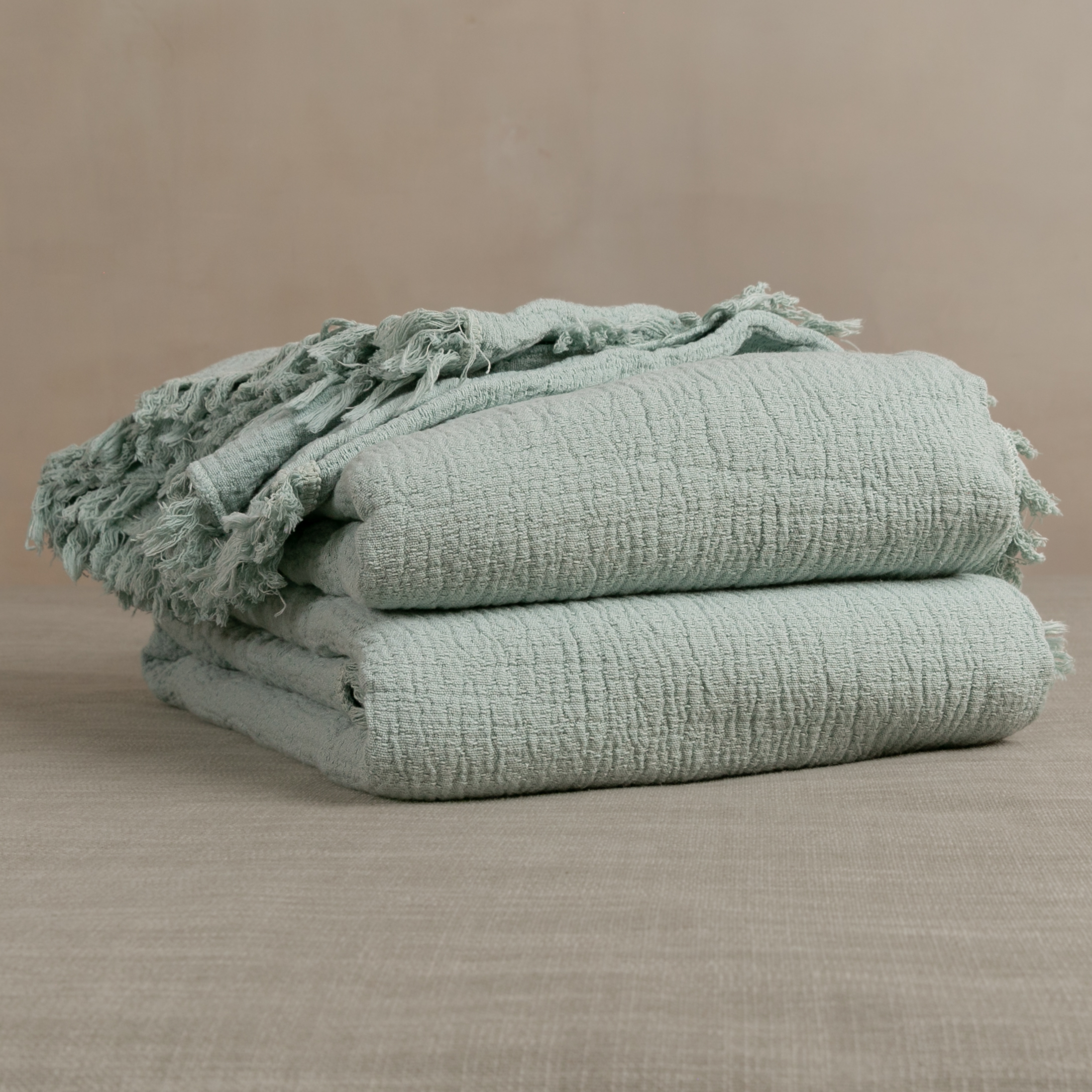 Inspirado en el color y las texturas que se forman en el agua, este bello cubrecama te cubrirá de la suave brisa de los noches de primavera y durante el verano. Tejido en algodón 100% y con acabado stone washed, el flequillo que le cuelga todo al rededor le da un look boho y fresco.