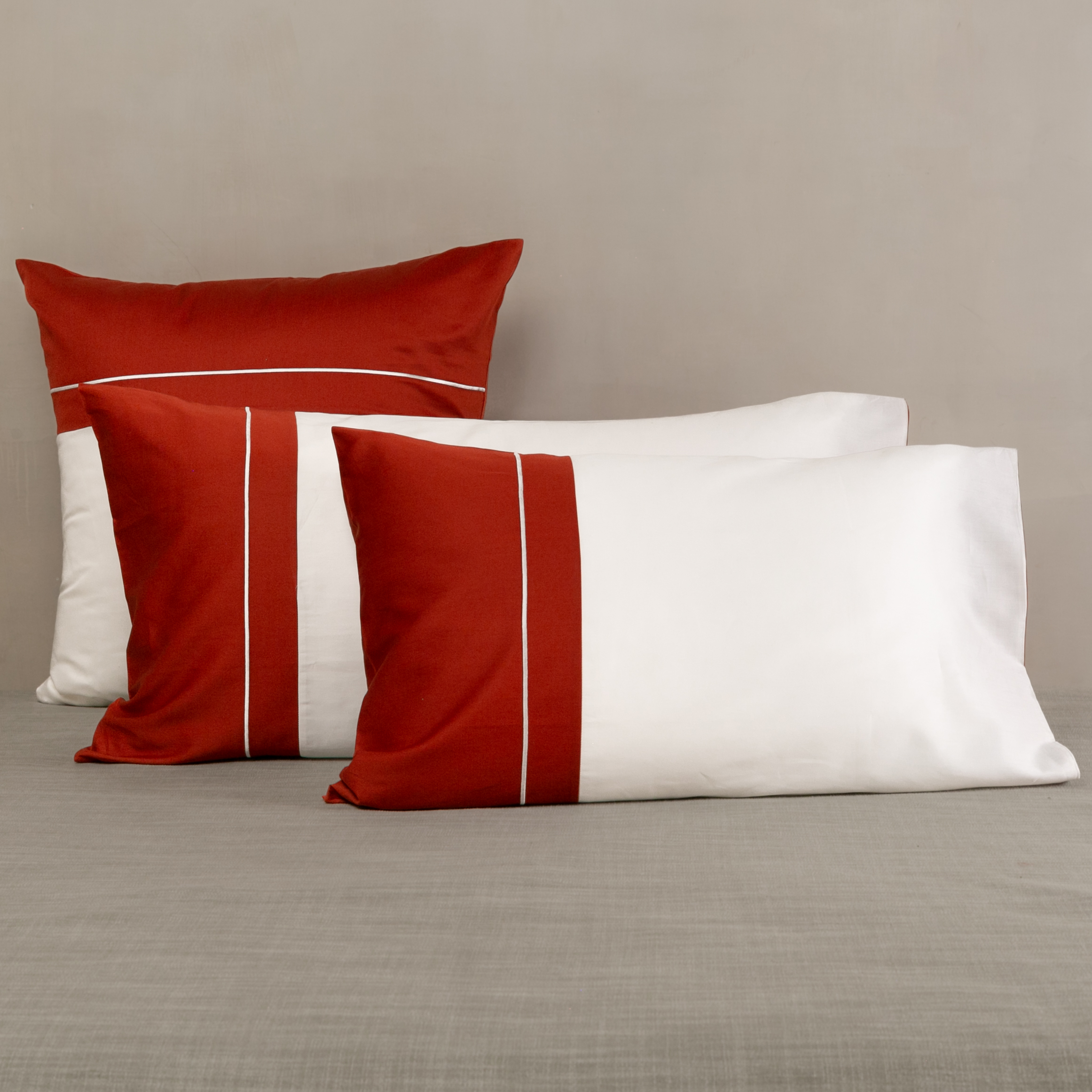 Inspirada en elementos de la arquitectura tradicional de las haciendas y la arquitectura contemporánea mexicana, esta funda decorativa bitonal juega con cenefas amplias y un festón que da estructura visual al diseño.