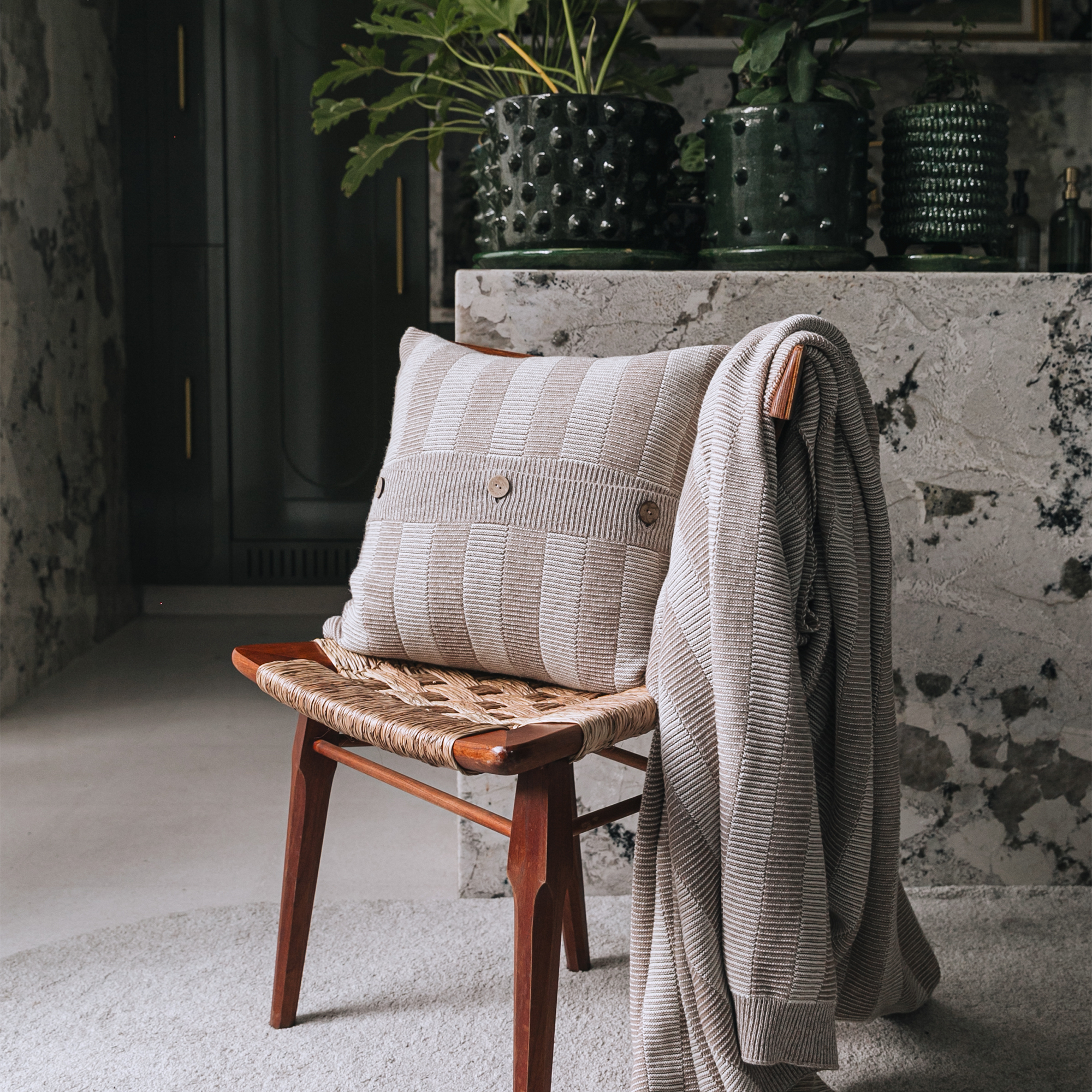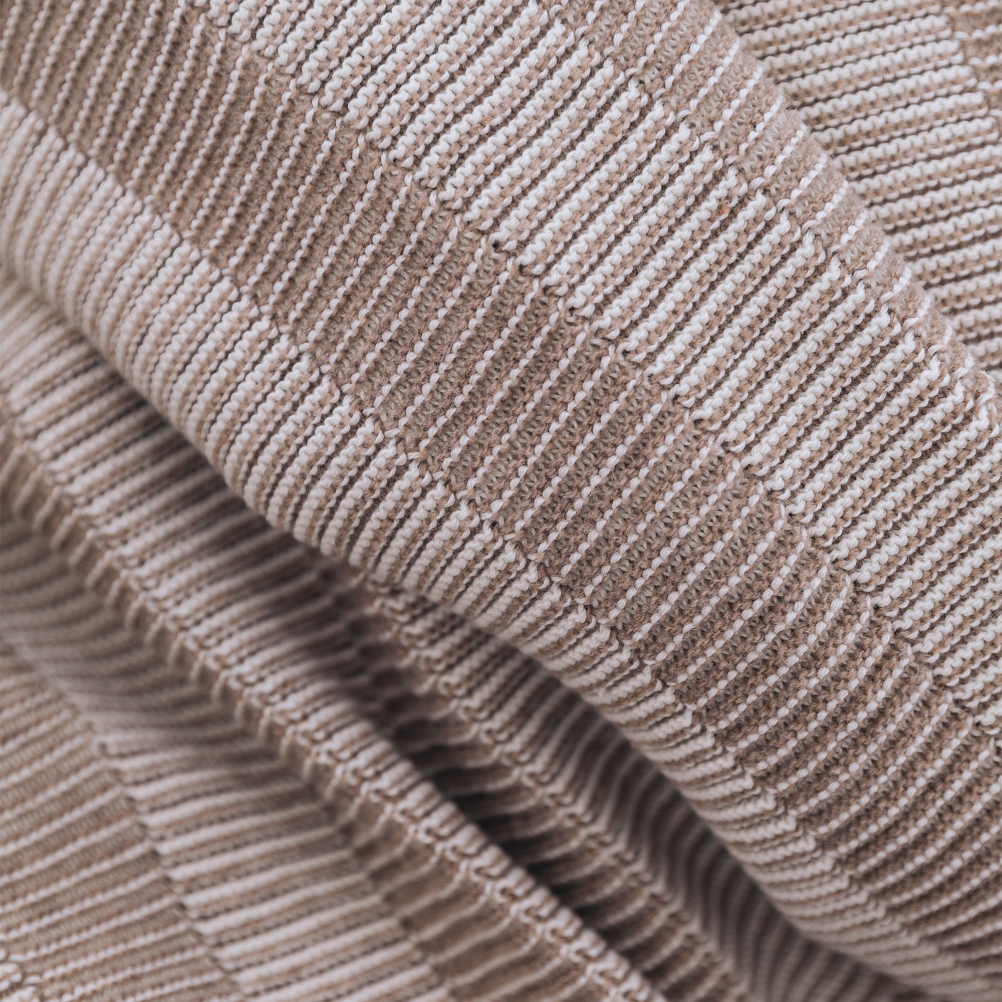 Esta frazada de lana, algodón y poliamida en colores arena y crudo, se destaca por su suavidad, calidez y agradable mano.