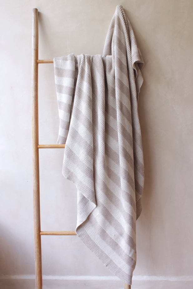 Carrara es una frazada con tejido ligero formado por rayas con tramado bicolor cuyo diseño y luminoso colorido recuerdan los tonos del mármol y la espléndida piedra veteada de la ilustre ciudad.