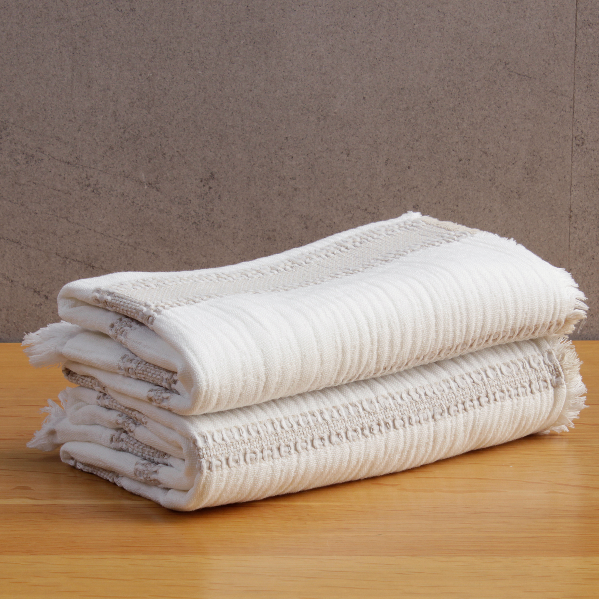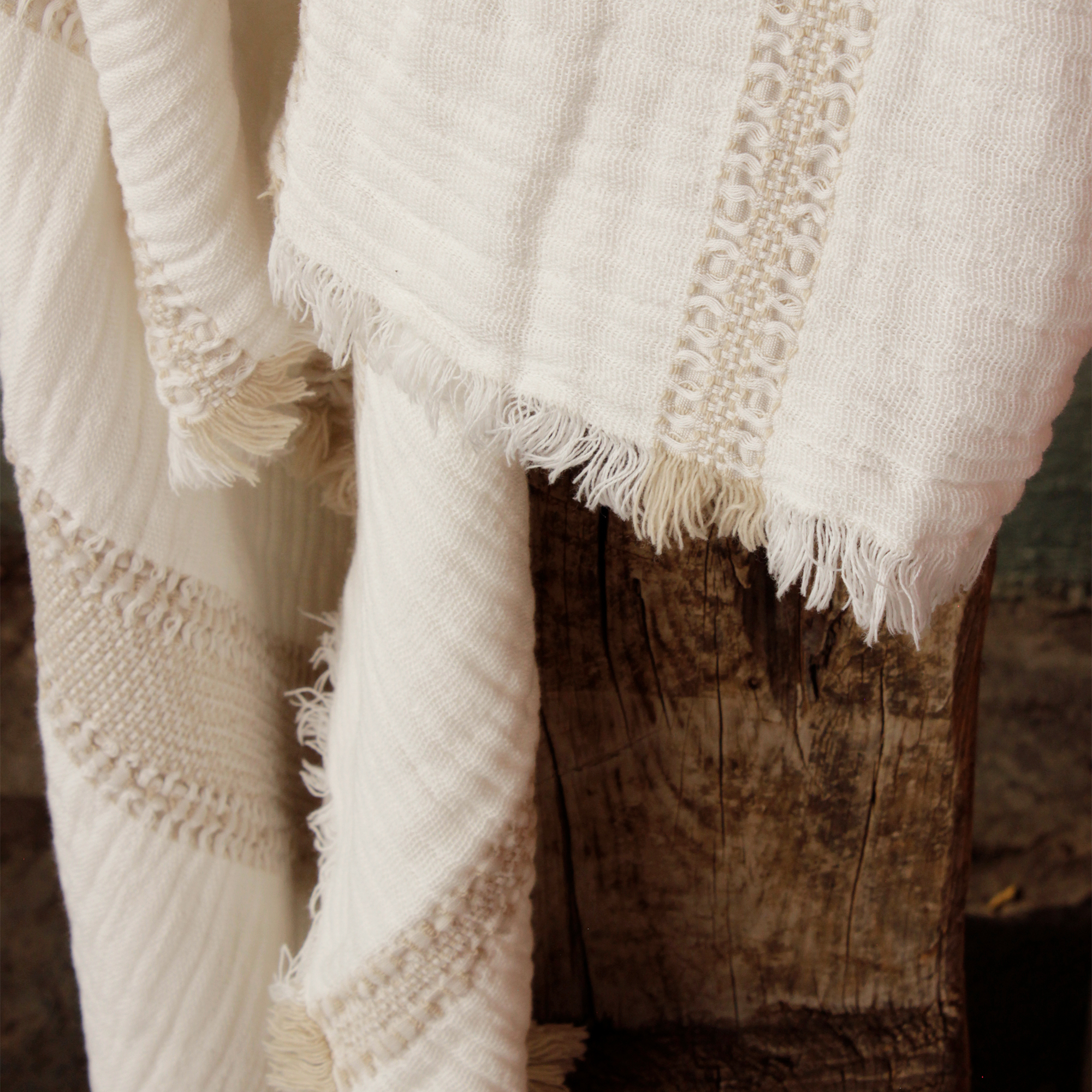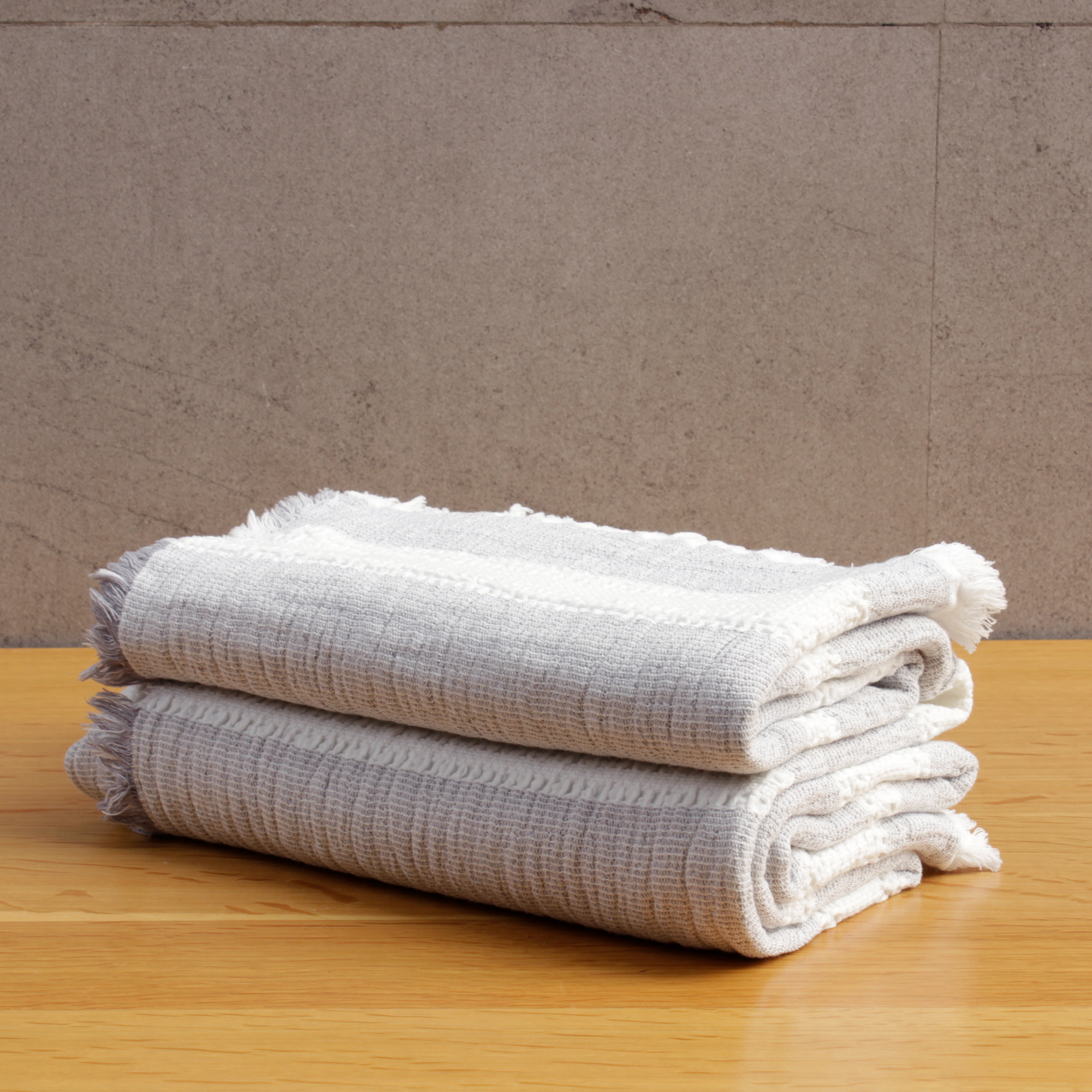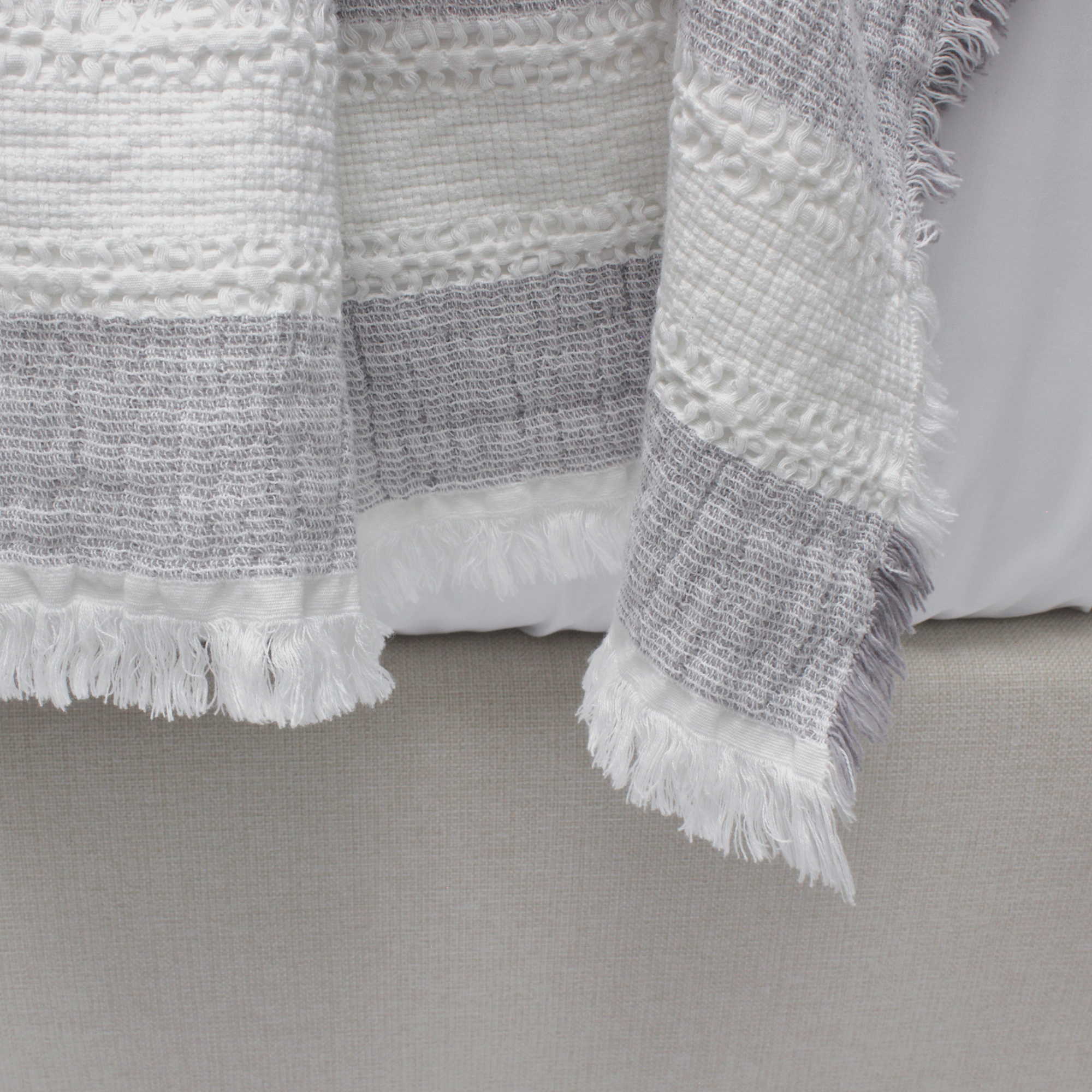 Frazada fresca y ligera, con un diseño de franjas y tejida en 100% algodón en una elegante y luminosa combinación de tonos grises azulados y crudo.
