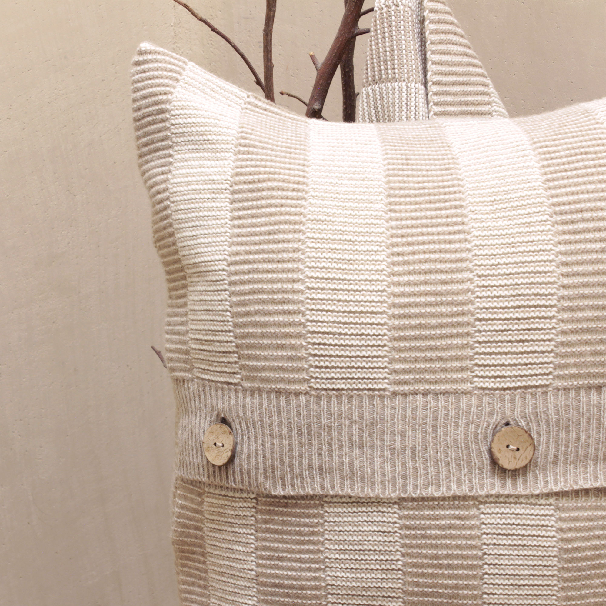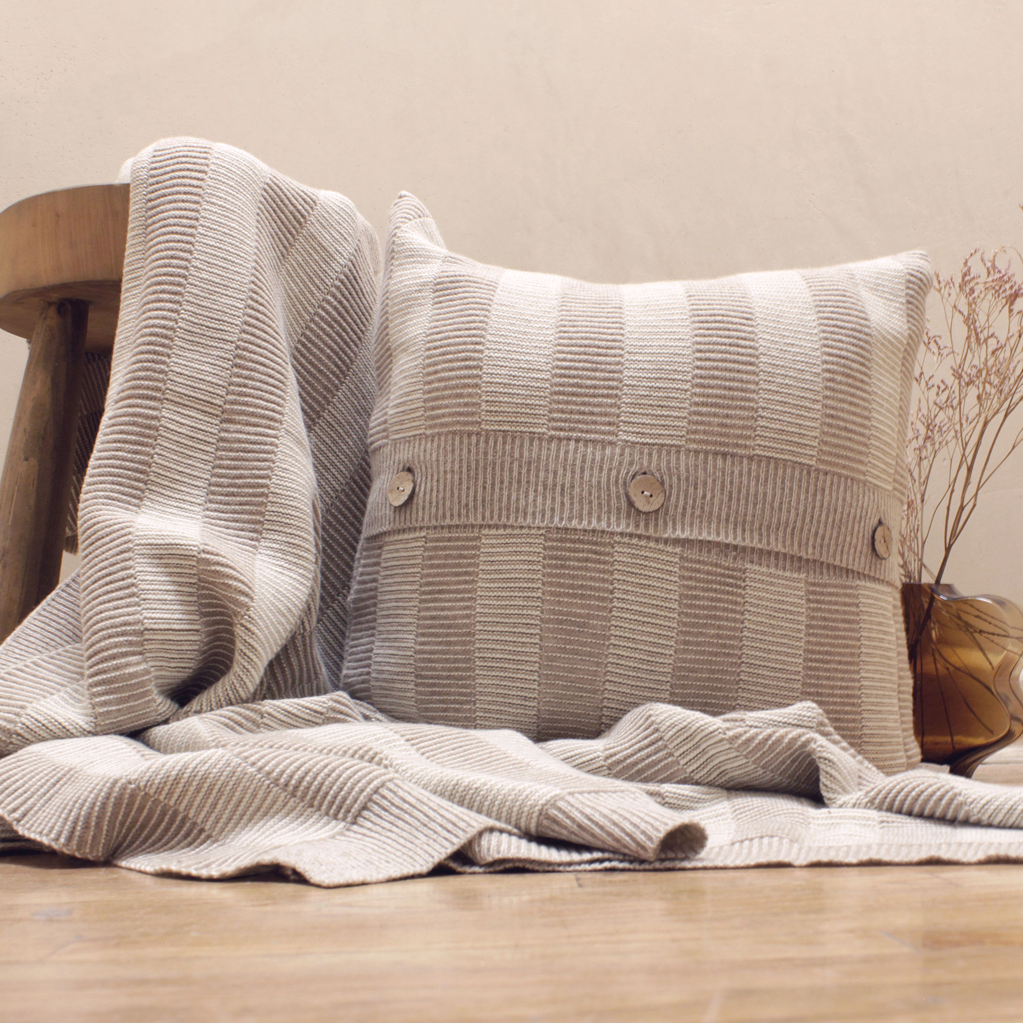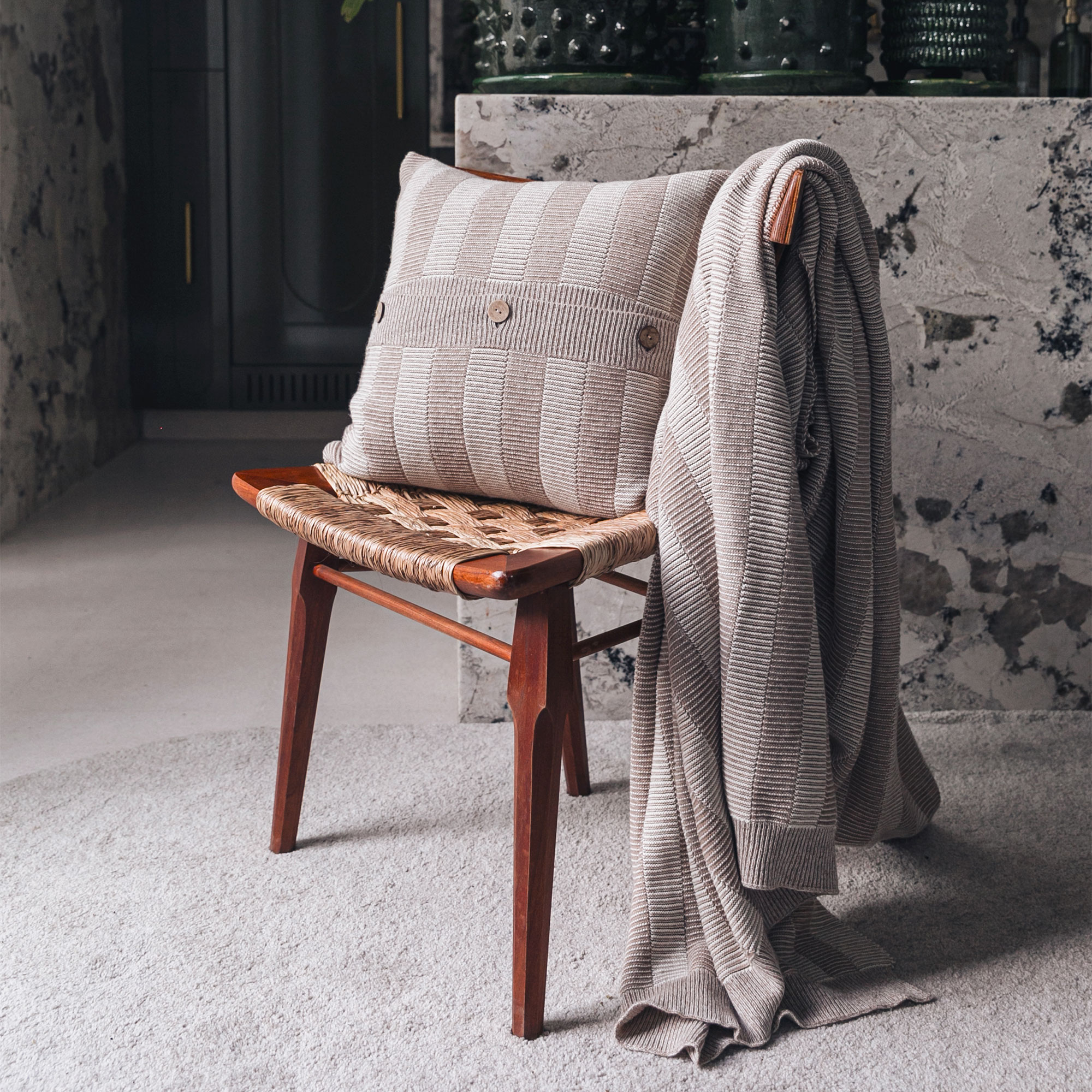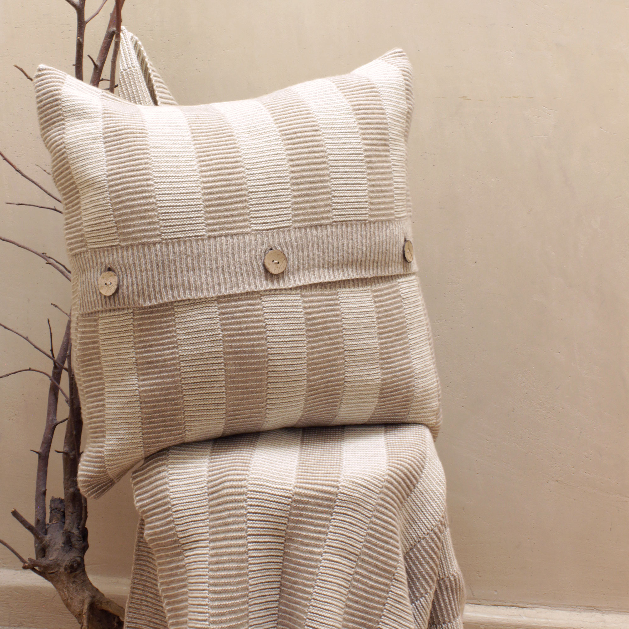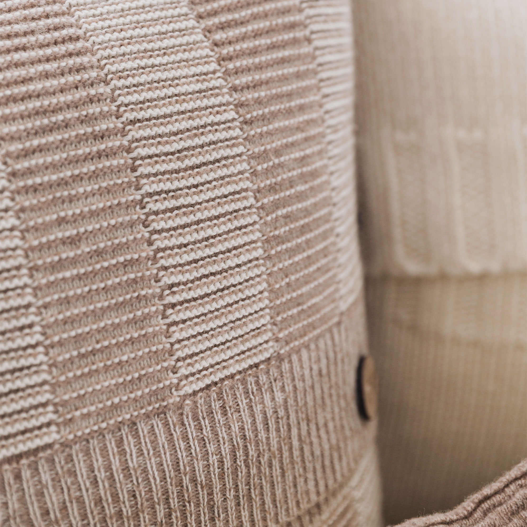 Esta funda de lana, algodón y poliamida en colores arena y crudo, se destaca por su suavidad, calidez y agradable mano.