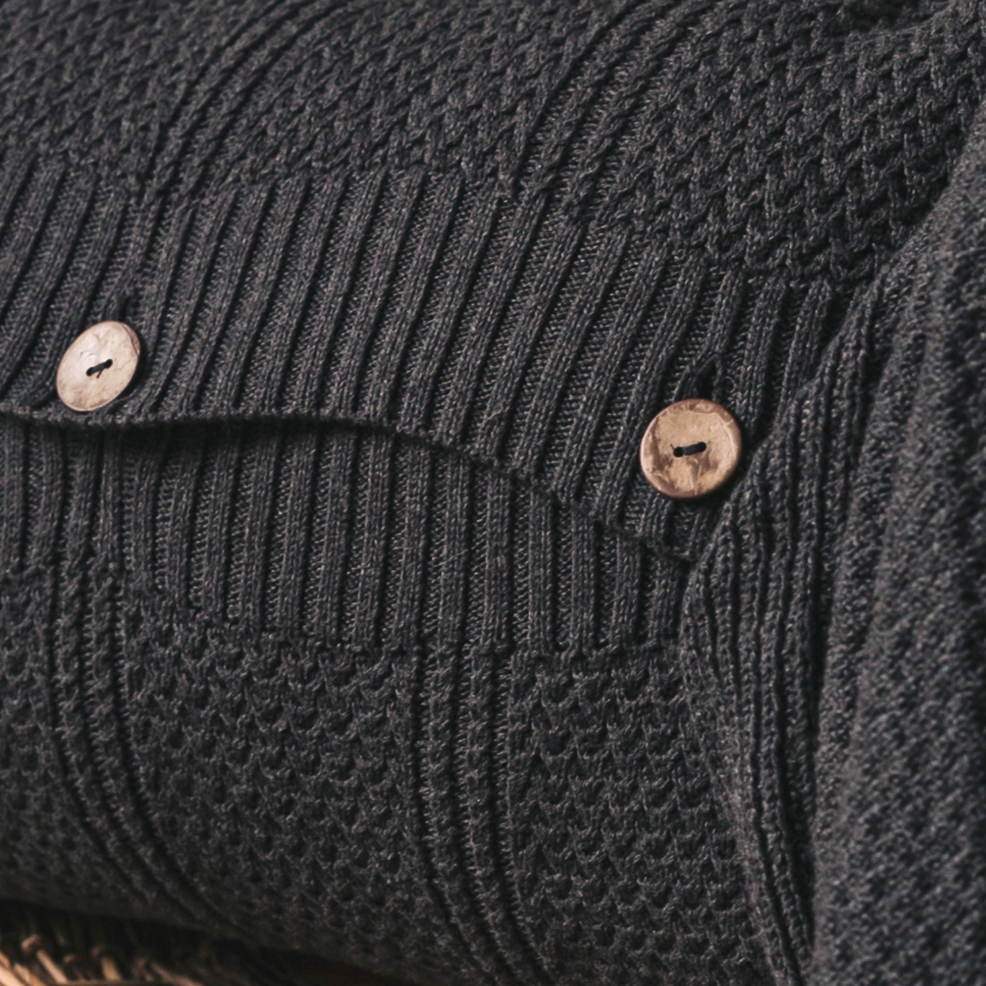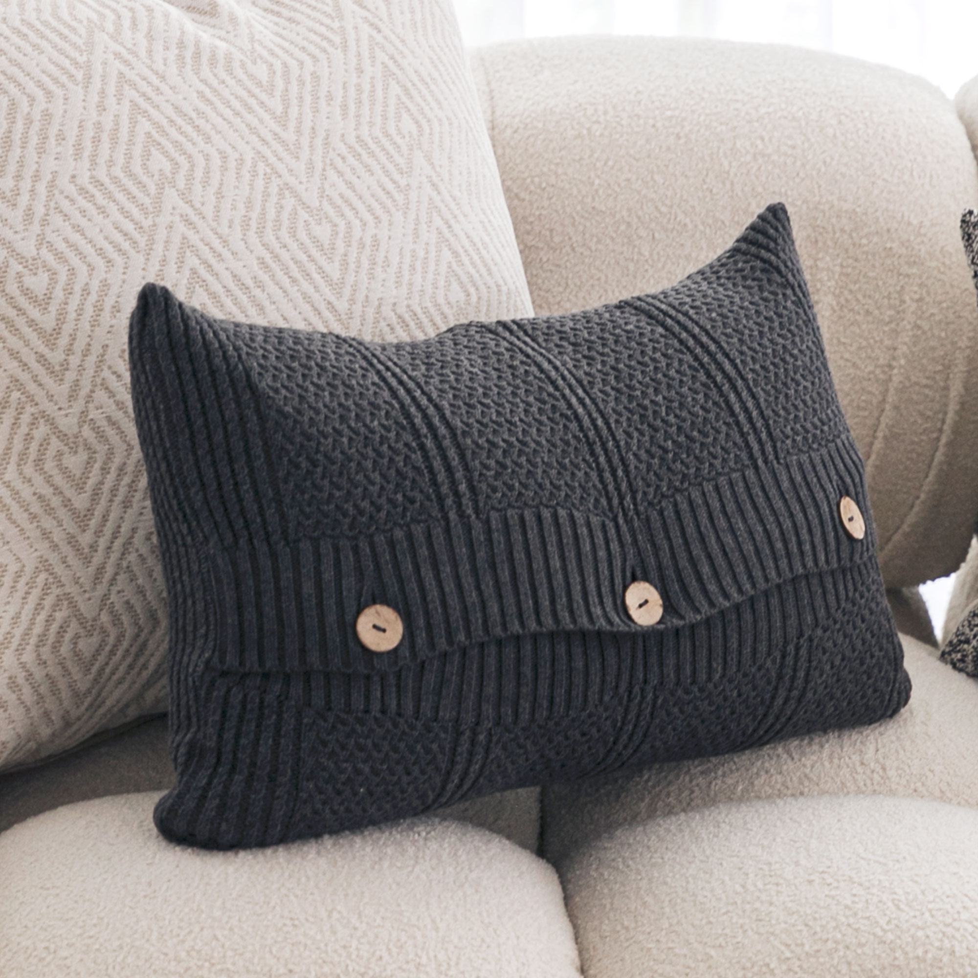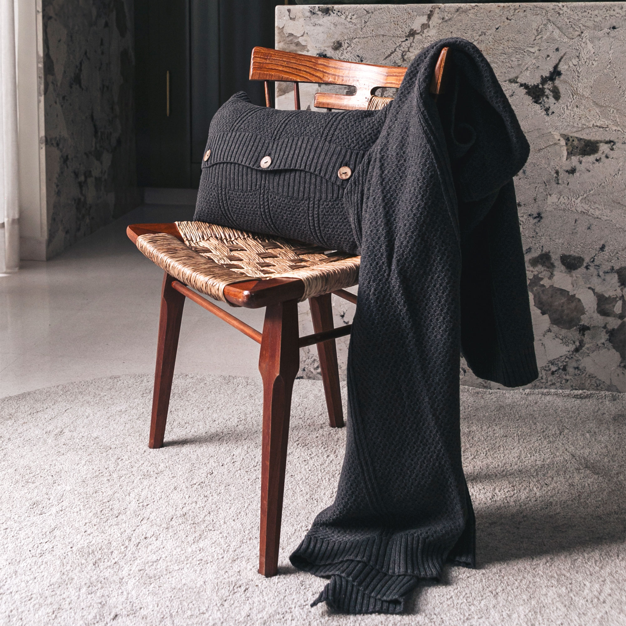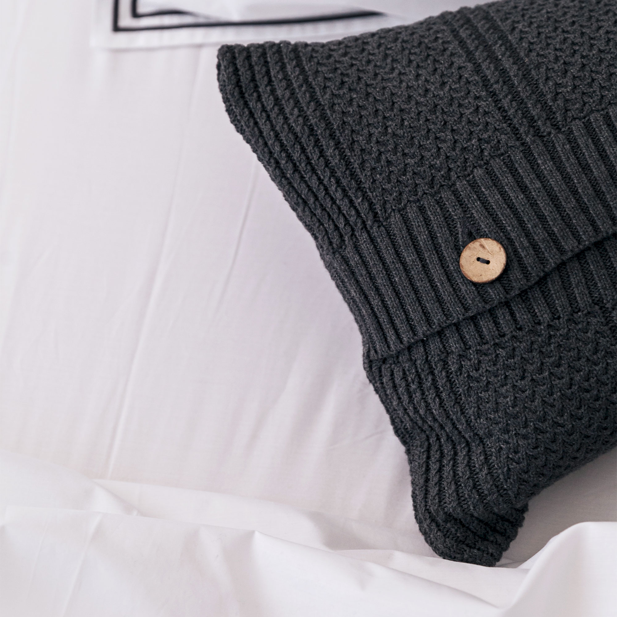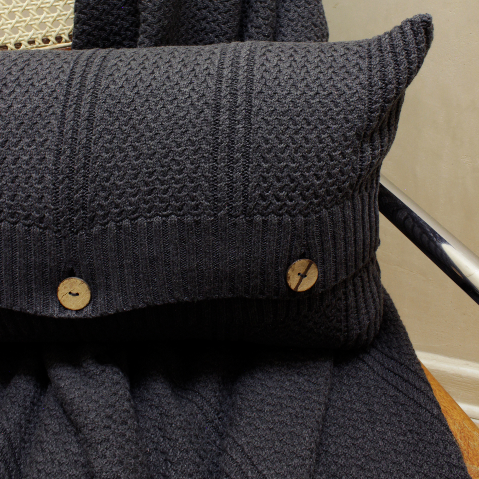 Esta funda de cojín en 100% de algodón en tejido de punto con diseño de amplias franjas texturizadas, se destaca por su estilo masculino y colorido gris oscuro jaspeado. Con cuerpo y soltura, esta frazada dará elegancia y sofisticación a tu sala o habitación.