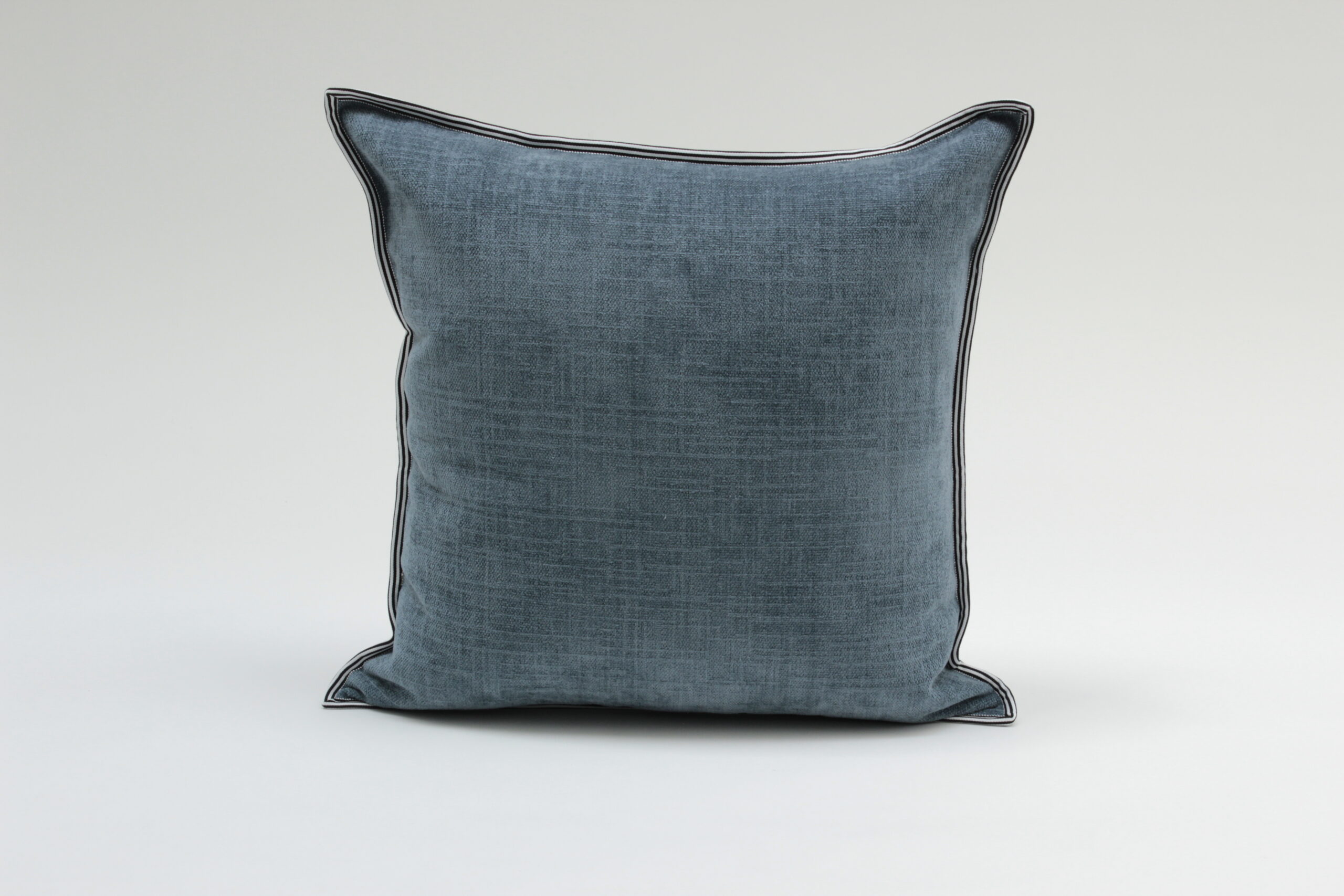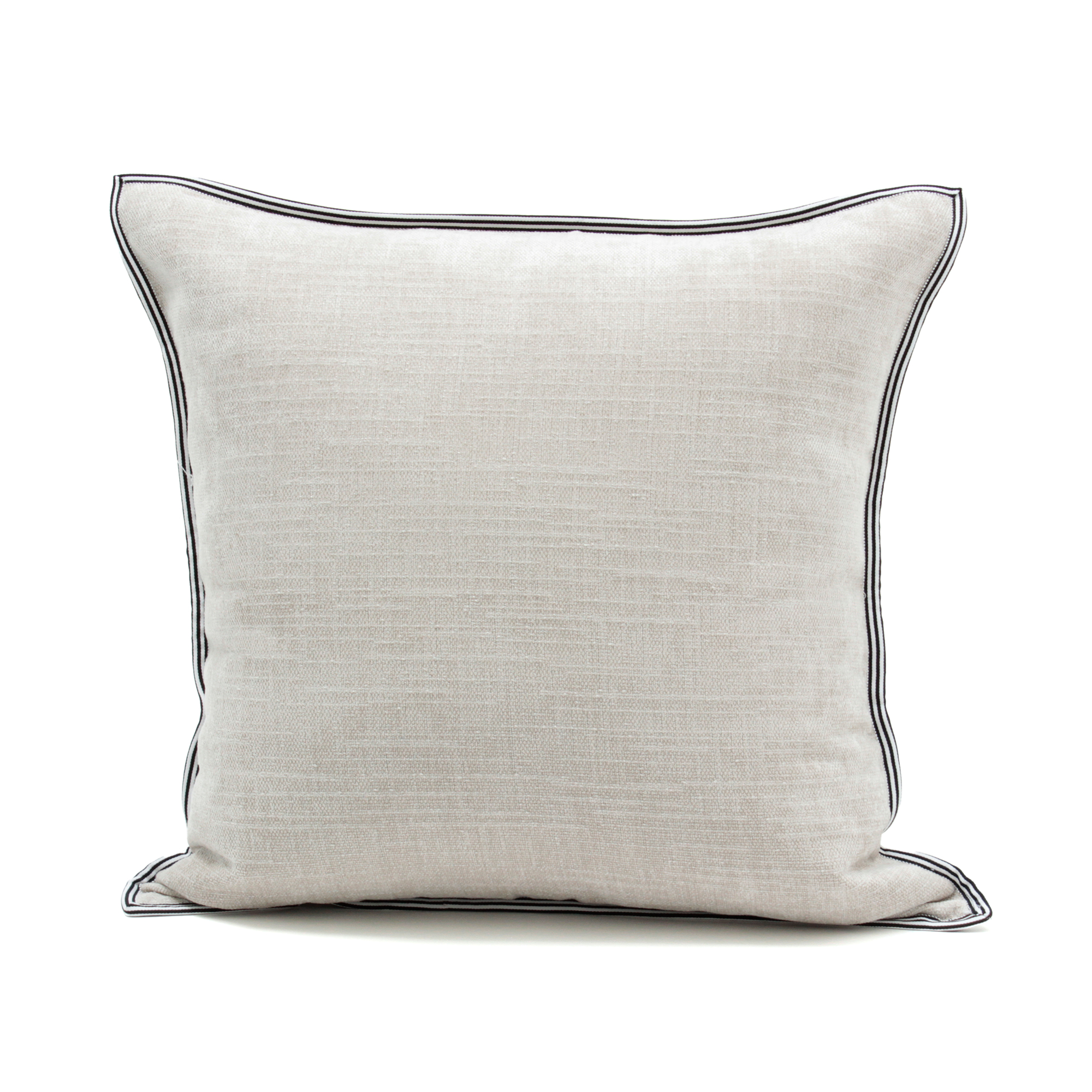 Funda de cojín bicolor y aterciopelada. Su confección con un bies decorativo de rayas blanco y negro le dará ese toque chic y gráfico a tu cama o sofá.