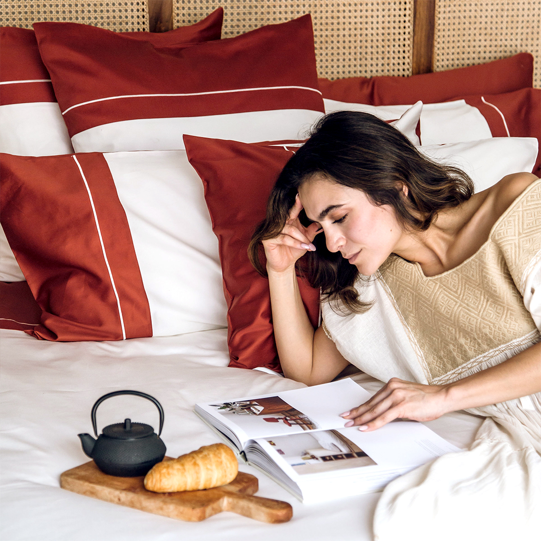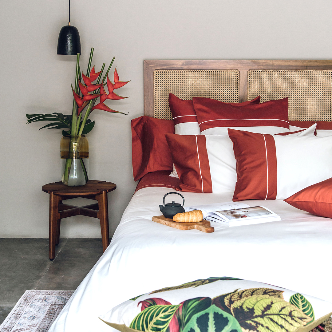 La funda está confeccionada en un satín 100% algodón de 300 hilos por pulgada y se cierra de forma discreta con unos botones ocultos que se encuentran en la parte inferior