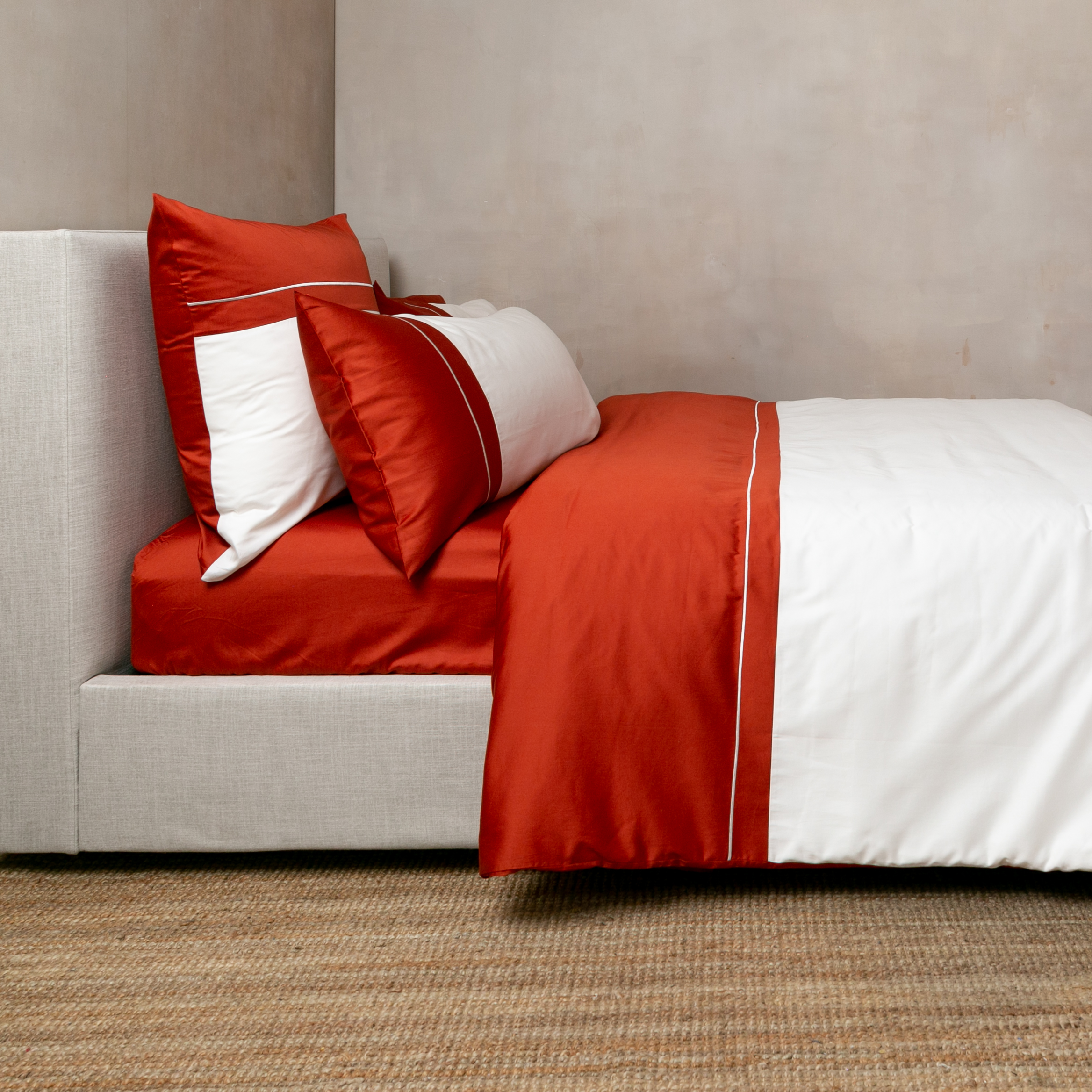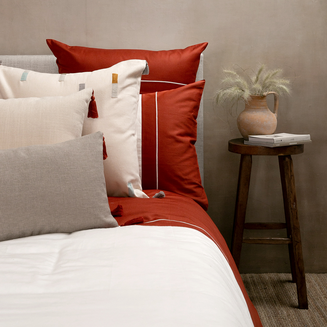 Inspirada en elementos de la arquitectura tradicional de las haciendas y la arquitectura contemporánea mexicana, esta funda de edredón bitonal juega con cenefas amplias y un festón que da estructura visual al diseño.