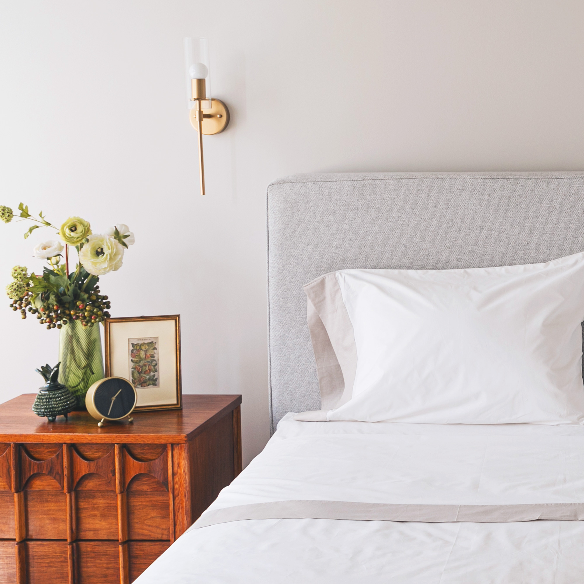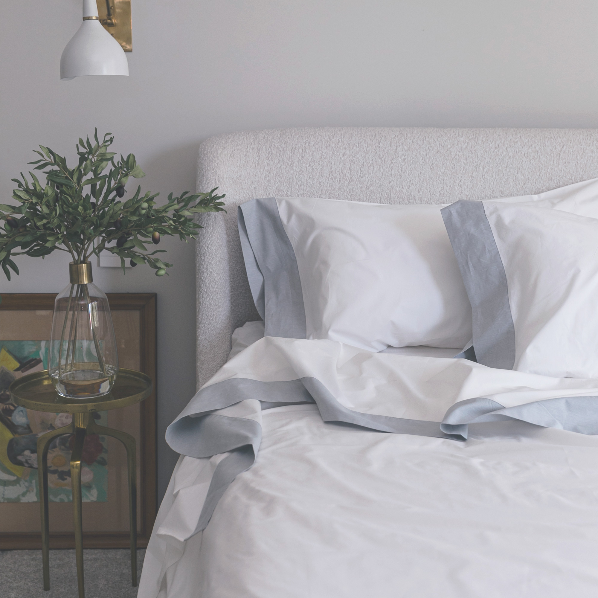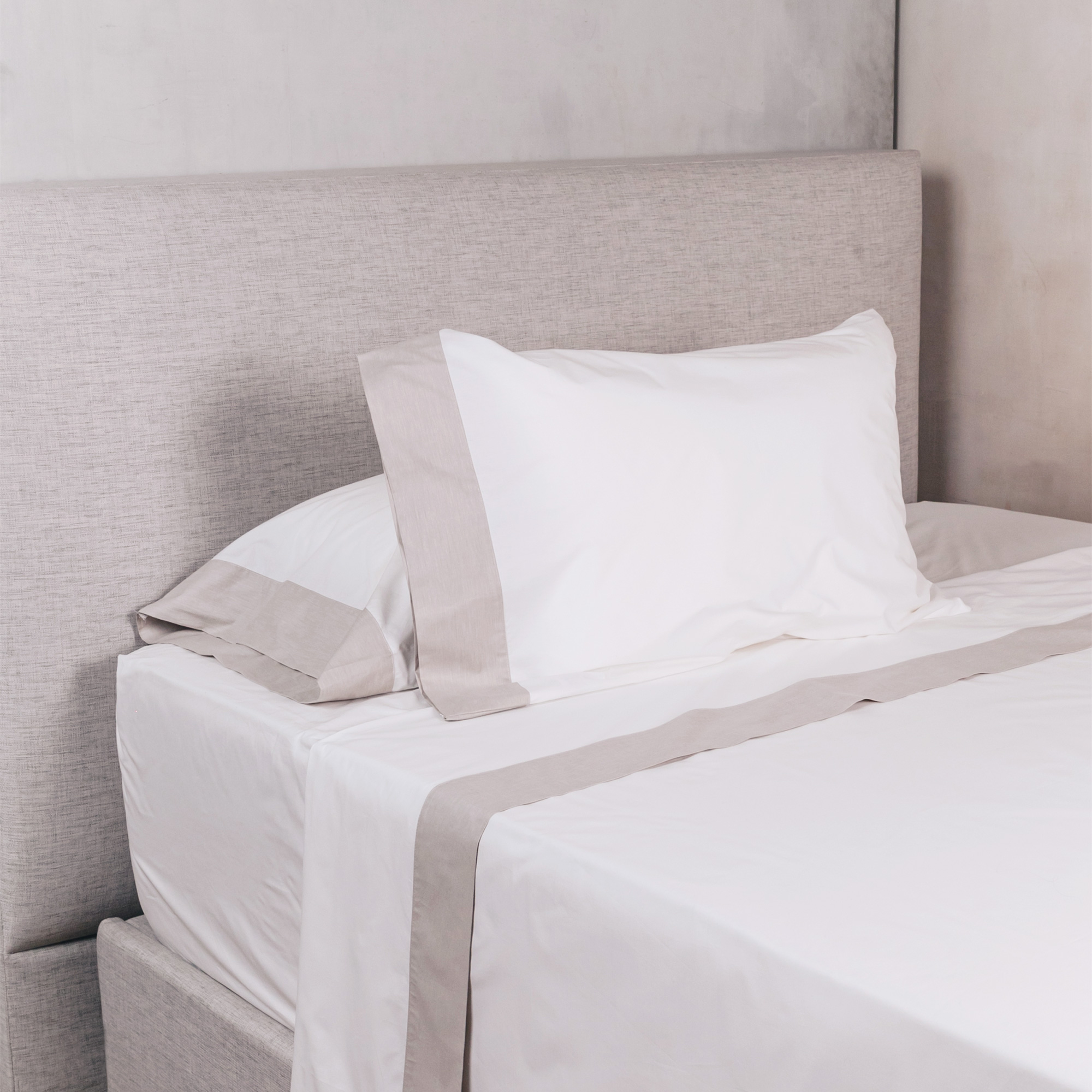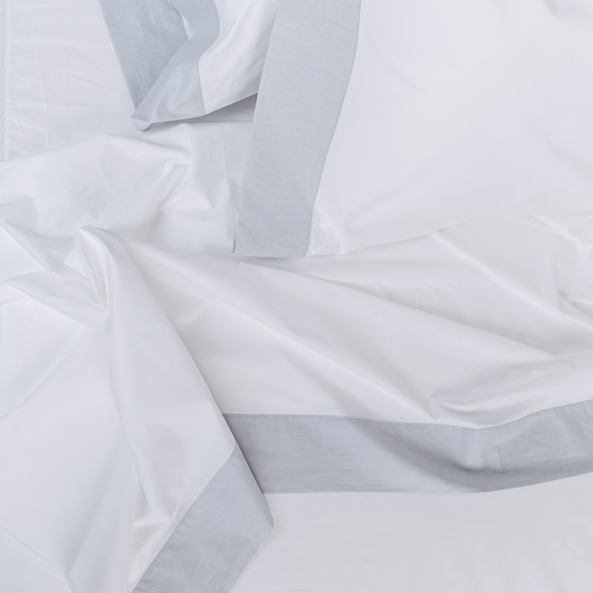 Elegante y atemporal, este juego de sábanas blancas en percal 100% algodón, confeccionado con cenefa contrastada en chambray tejido en tonos blancos y grises azulados, le otorgará a tu cama sofisticación y modernidad.